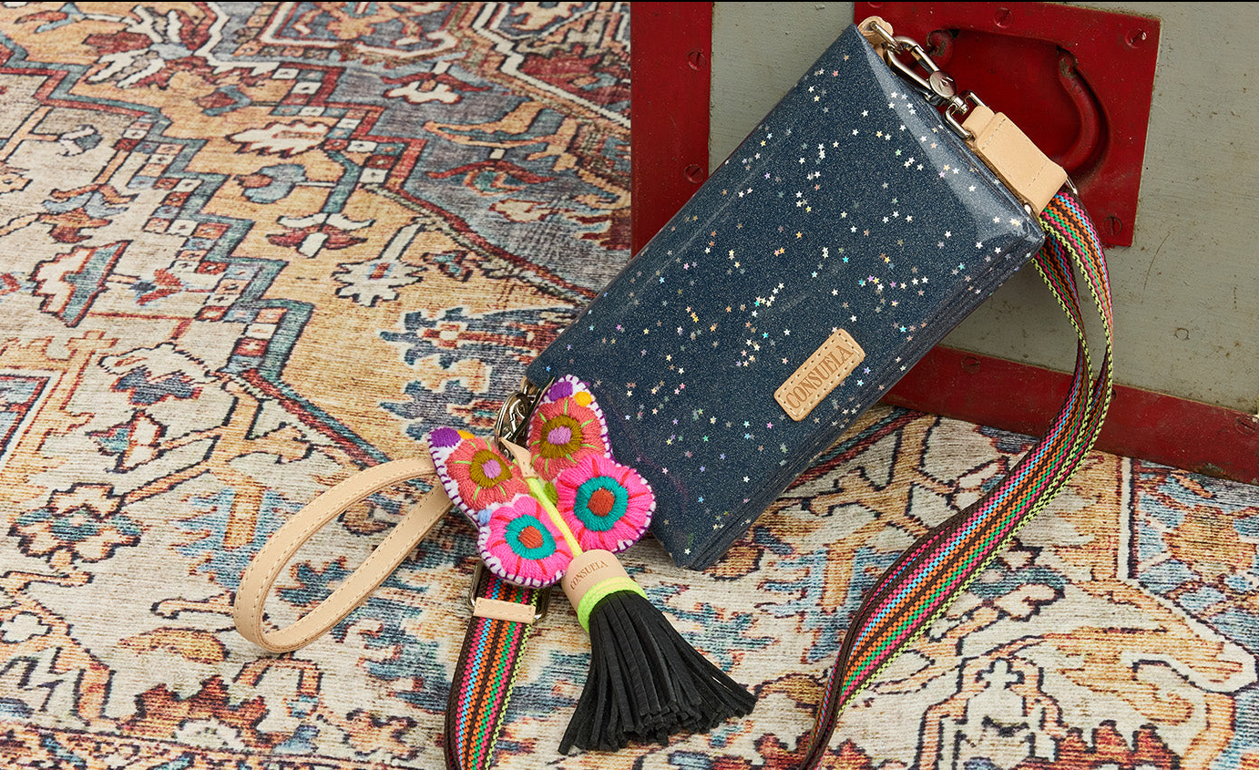 - Included detachable wristlet strap and adjustable woven crossbody strap