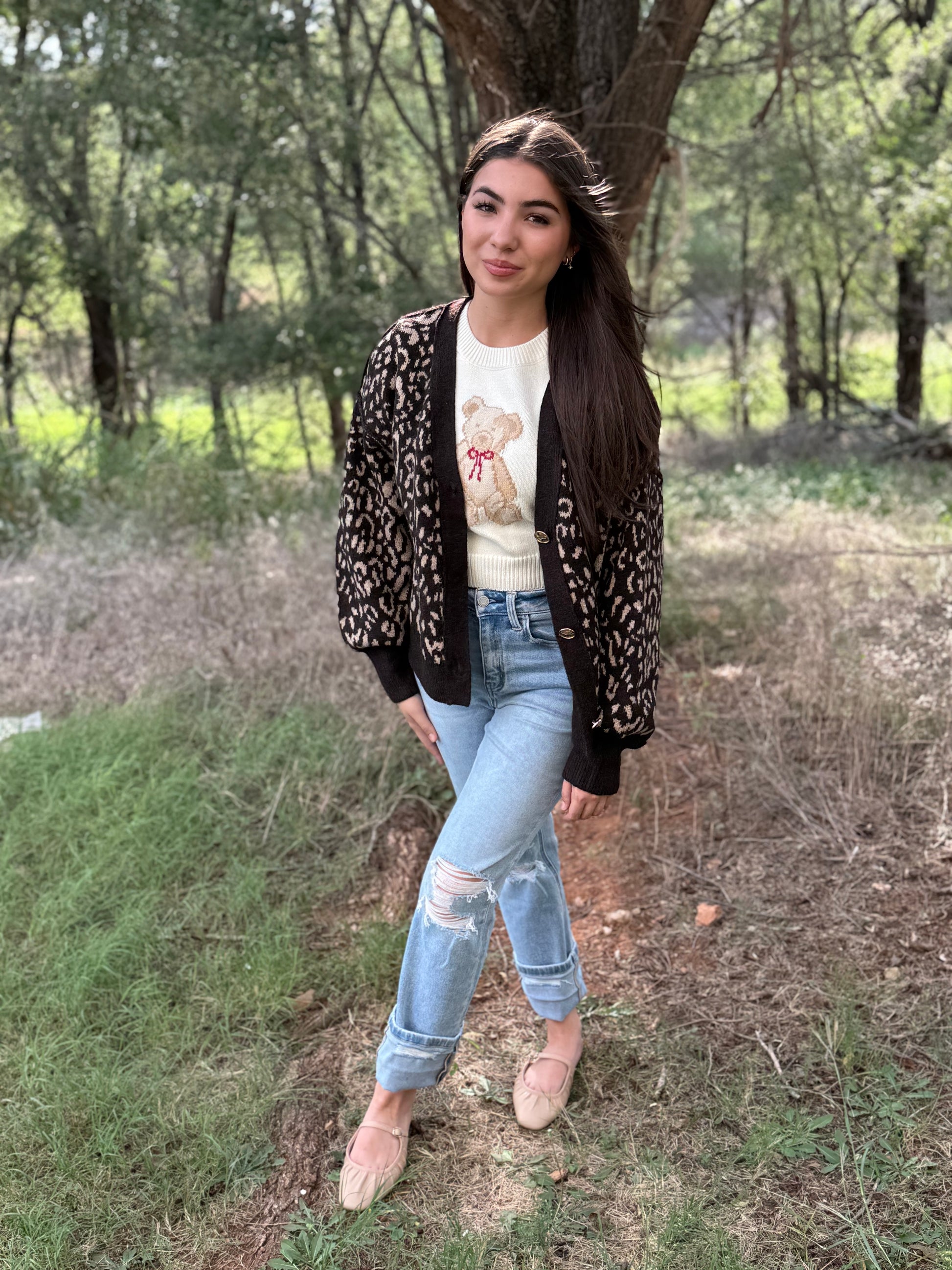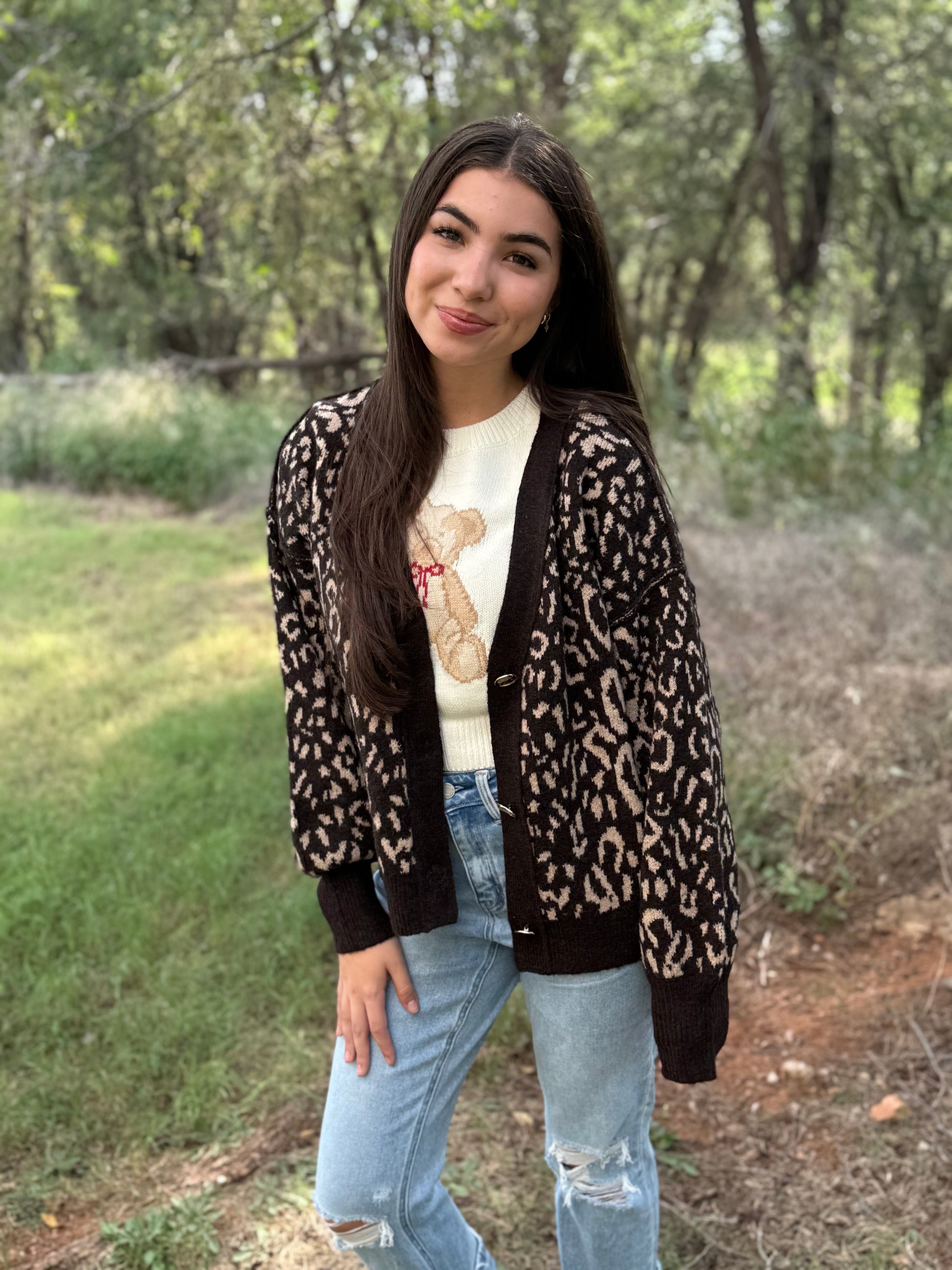 Elevate your wardrobe with the Rich Brown Cheetah Cardigan, featuring a sophisticated dark brown and tan cheetah print. Designed with subtle gold buttons, this cardigan offers a refined contrast that enhances its classic animal pattern. Ideal for layering, it combines stylish versatility with an expert touch of luxury, making it a standout piece for both casual and polished looks.