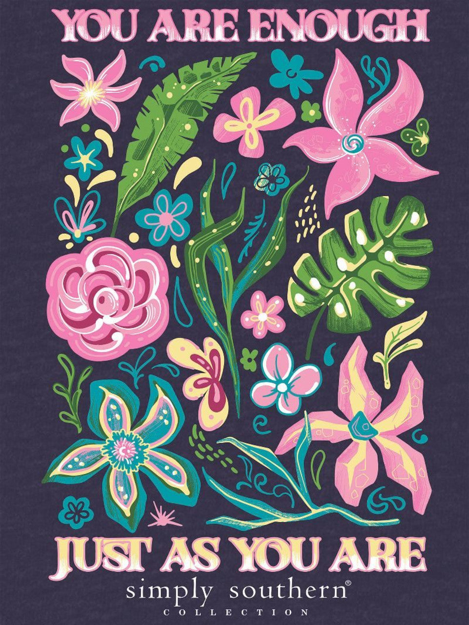 Heather navy short sleeve shirt with the phrase 'You are enough just as you are' and a collage of flowers and plants in a chalk art style. Simply Southern logo below and on left chest. 100% cotton. Unisex sizing.