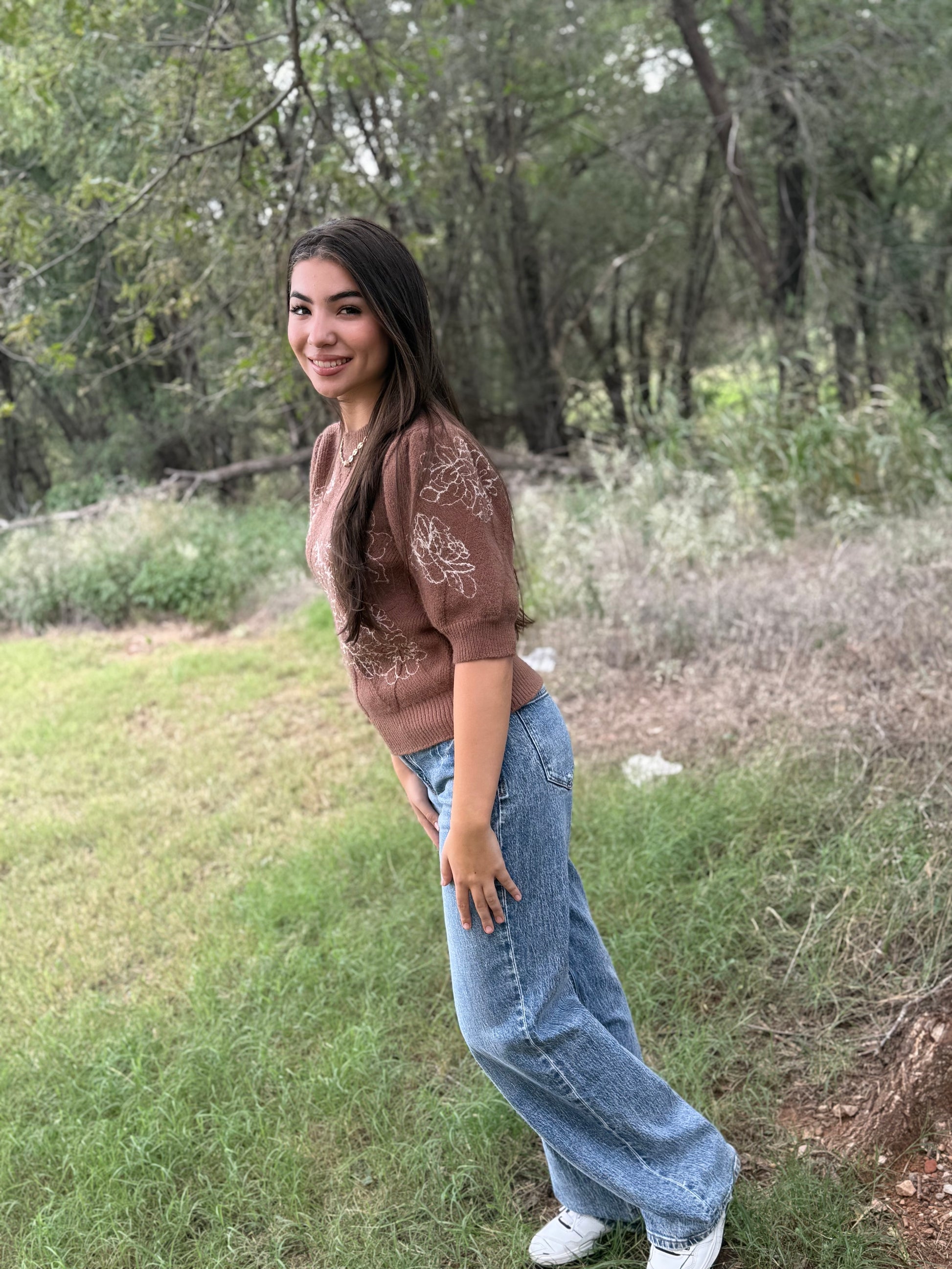 The Thankful Sweater features elegant brown puff sleeves adorned with delicate embroidery, combining classic charm with a modern silhouette. Crafted for comfort and style, this sweater adds a refined touch to any wardrobe, perfect for layering during cooler seasons or dressing up casual looks with an expert finish.